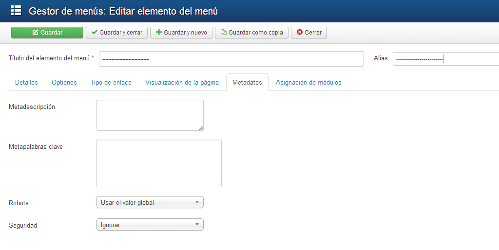 Los metadatos puestos en los menús manda sobre los que están en los artículos y sobre lo de las categorías, es conveniente utilizar esta opción cuando por necesidades de organización en nuestra web o para algún Ítem en particular de Joomla (por ejemplo una extensión) necesitemos hacerlo.